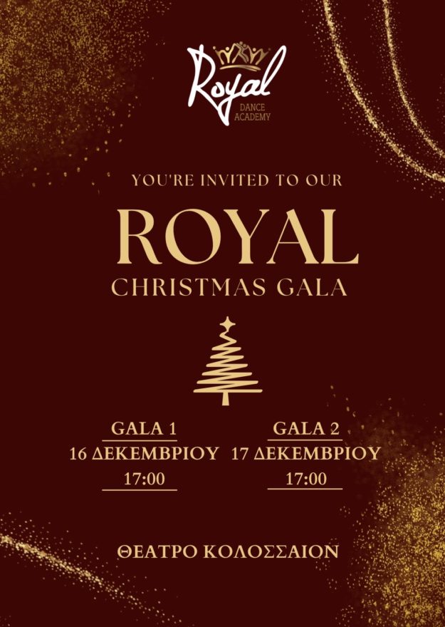 Με μεγάλη χαρά σας προσκαλούμε να γιορτάσετε μαζί μας τα φετινά Χριστούγεννα και να ταξιδέψετε μέσα από τις χριστουγεννιάτικες χορογραφίες των μαθητών και των δασκάλων μας! Christmas Gala 1: Πέμπτη 16/12 – 17:00 μ.μ. Christmas Gala 2: Παρασκευή 17/12 – 17:00 μ.μ. Σας περιμένουμε όλους! Royal Dance Academy