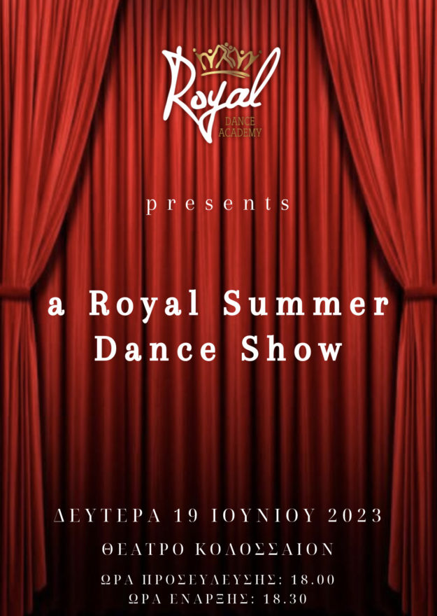 Η Ακαδημία Χορού Royal σας προσκαλεί τη Δευτέρα 19 Ιουνίου 2023 στην καλοκαιρινή τελική μουσικοχορευτική της παράσταση στο θέατρο «Κολοσσαίον». Με χορευτικές επιδείξεις και μουσικά show των μαθητών και των δασκάλων μας θα κλείσουμε και θα αποχαιρετήσουμε τη φετινή χορευτική σεζόν! Ώρα προσέλευσης: 6.00 μ.μ. Ώρα έναρξης: 6.30 μ.μ. Σας περιμένουμε όλους για ένα απολαυστικό…