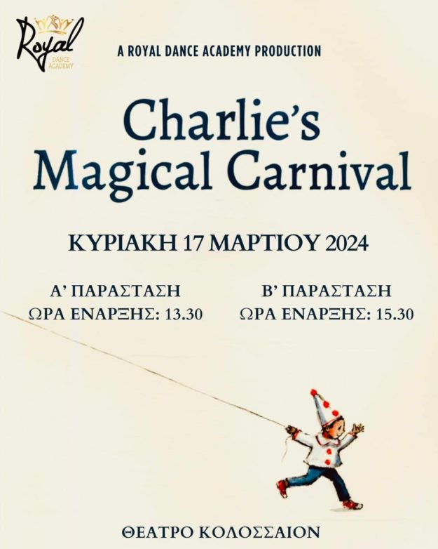 O Charlie λατρεύει τα καρναβάλια και ταξιδεύει με τη φαντασία του σε μία μαγευτική γιορτή καρναβαλιών. Είστε όλοι προσκεκλημένοι να γιορτάσετε μαζί μας, να γνωρίσετε από κοντά τους ήρωες μας και να μπείτε στον μαγικό κόσμο της φαντασίας τους! Μια θεατρική παράσταση που θα μαγέψει μικρούς και μεγάλους! Σας περιμένουμε όλους!