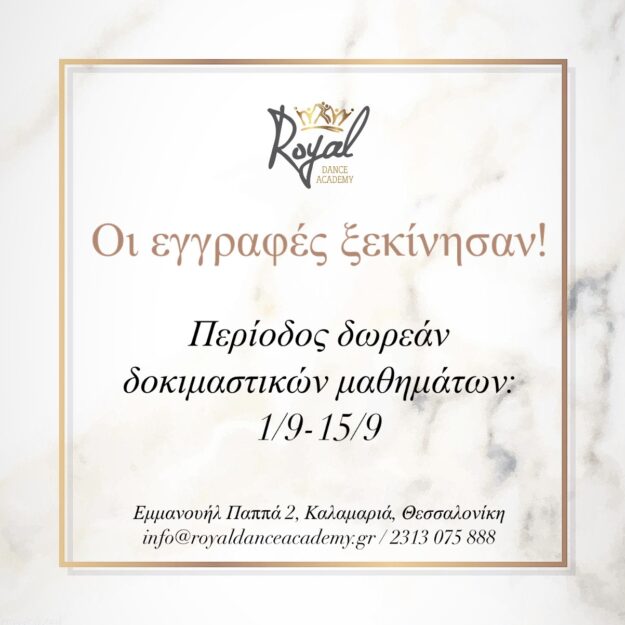 Οι εγγραφές ξεκίνησαν! Κλείσε ένα δωρεάν δοκιμαστικό μάθημα σε οποιοδήποτε είδος χορού επιθυμείς και γίνε κι εσύ μέλος της μεγάλης μας οικογένειας! Για περισσότερες πληροφορίες σχετικά με το πρόγραμμα των μαθημάτων, μπορείς να ενημερωθείς από τη Γραμματεία της Ακαδημίας μας στο τηλ. 2313 075 888.