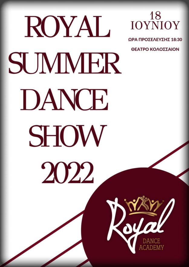 Η Ακαδημία Χορού Royal σας προσκαλεί τη Δευτέρα 19 Ιουνίου 2023 στην καλοκαιρινή τελική μουσικοχορευτική της παράσταση στο θέατρο «Κολοσσαίον». Με χορευτικές επιδείξεις και μουσικά show των μαθητών και των δασκάλων μας θα κλείσουμε και θα αποχαιρετήσουμε τη φετινή χορευτική σεζόν! Ώρα προσέλευσης: 6.00 μ.μ. Ώρα έναρξης: 6.30 μ.μ. Σας περιμένουμε όλους για ένα απολαυστικό…