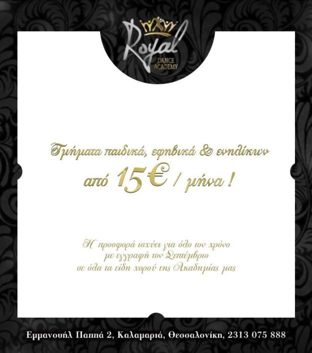 Η προσφορά ισχύει για όλο τον χρόνο με εγγραφή τον Σεπτέμβριο σε όλα τα είδη χορού της Ακαδημίας μας.