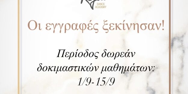 Οι εγγραφές ξεκίνησαν! Κλείσε ένα δωρεάν δοκιμαστικό μάθημα σε οποιοδήποτε είδος χορού επιθυμείς και γίνε κι εσύ μέλος της μεγάλης μας οικογένειας! Για περισσότερες πληροφορίες σχετικά με το πρόγραμμα των μαθημάτων, μπορείς να ενημερωθείς από τη Γραμματεία της Ακαδημίας μας στο τηλ. 2313 075 888.