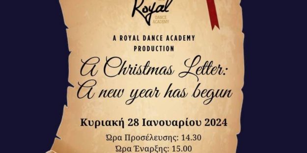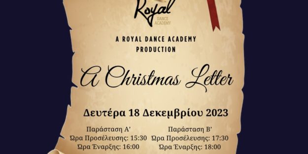 Η αντίστροφη μέτρηση έχει ξεκινήσει! Σας προσκαλούμε όλους στη χριστουγεννιάτικη μουσικοχορευτική παράσταση της Ακαδημίας μας “A Christmas Letter” την Δευτέρα 18 Δεκεμβρίου στο θέατρο “Κολοσσαίον”. Ελάτε να γράψουμε μαζί το πιο ξεχωριστό χριστουγεννιάτικο γράμμα στον Άγιο Βασίλη! Σας περιμένουμε όλους σε μία μοναδική συνάντηση χορού και μουσικής σε άκρως εορταστικό κλίμα! Get Ready… Royal Dance…